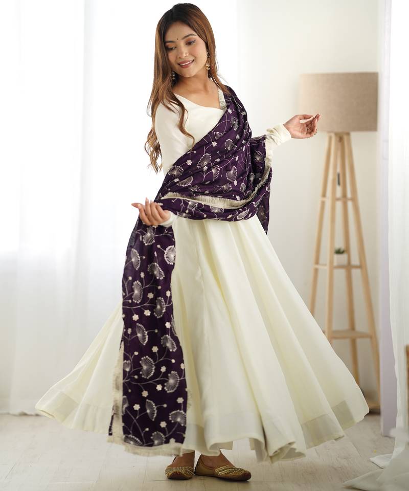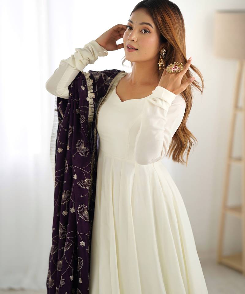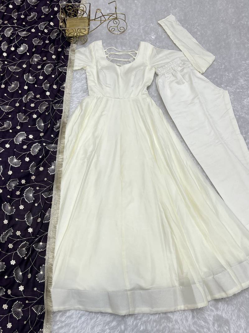 Cream festive wear designer heavy pure soft vichitra silk readymade suit stitched