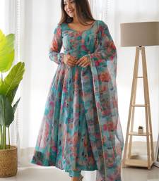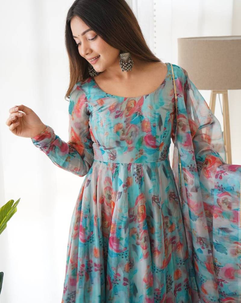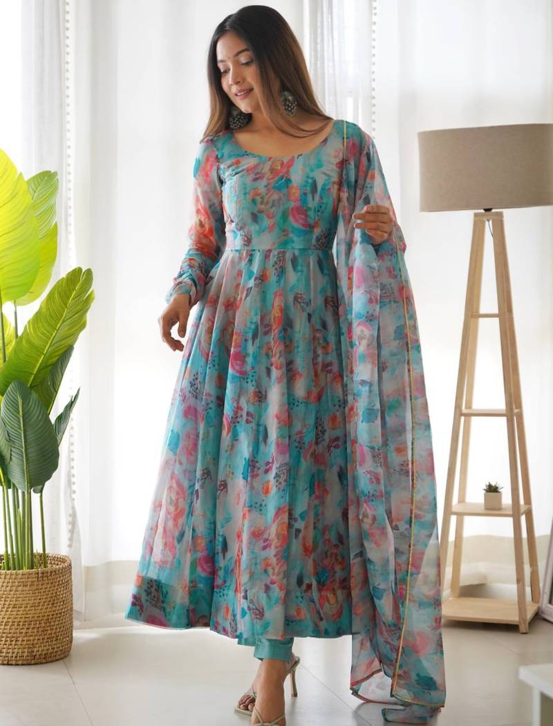 Multi festive wear designer heavy pure soft tabby organza silk flower print work readymade suit stitched