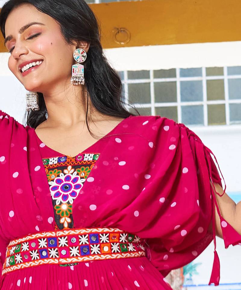| Product Name | Pink Festive Wear Designer Georgette Bandhani Print With Gamathi Work With Real Mirror Readymade Suit | |