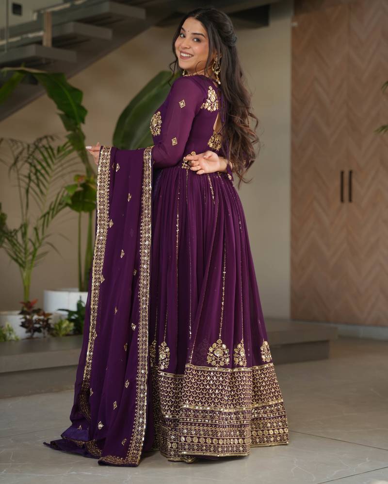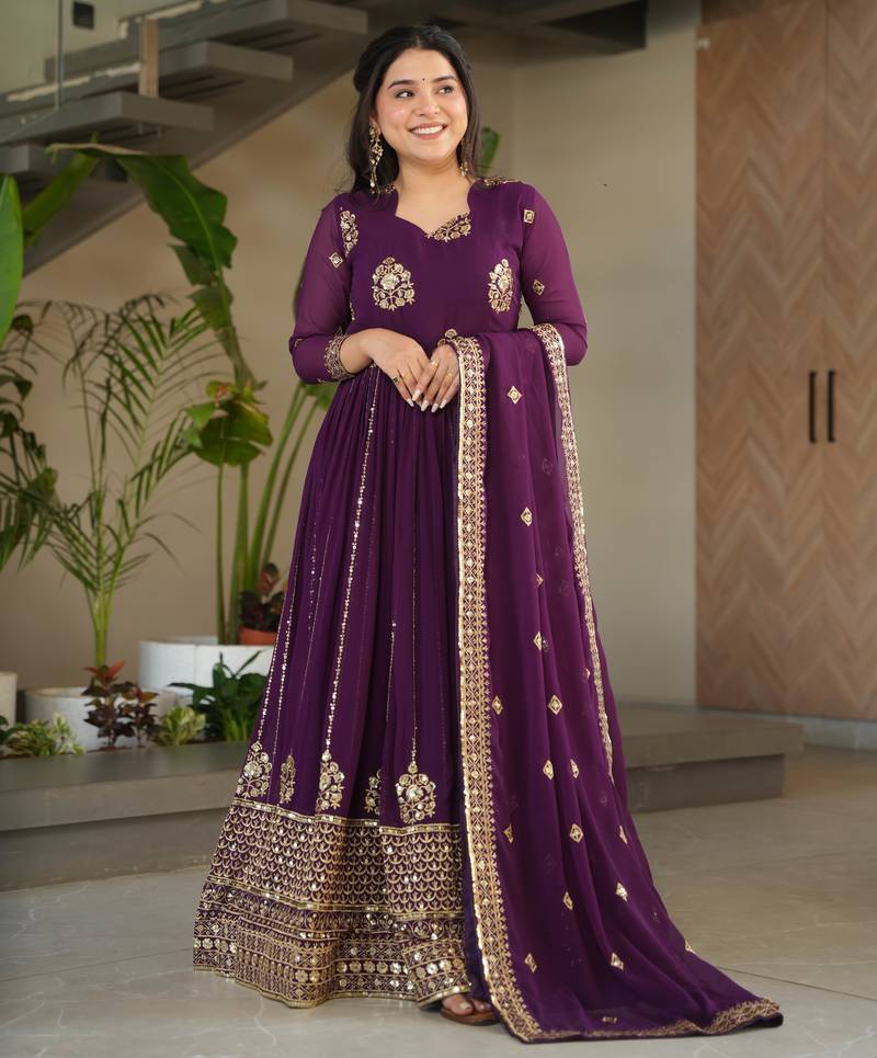 | Product Name | Wine Festive Wear Designer Faux Blooming Georgette Zari & Sequins Embroidered Work Readymade Suit | |