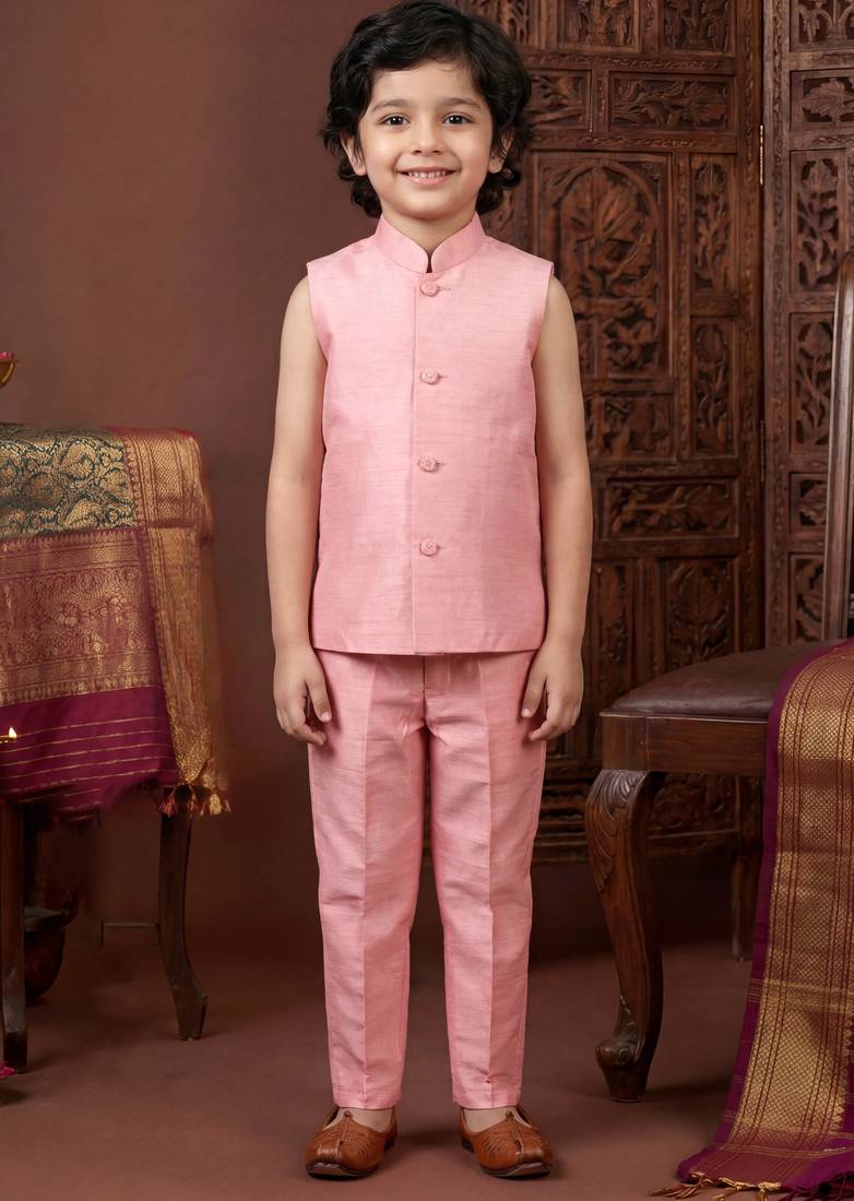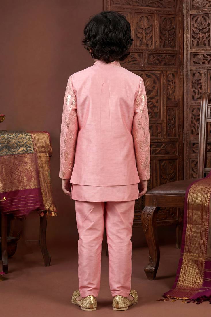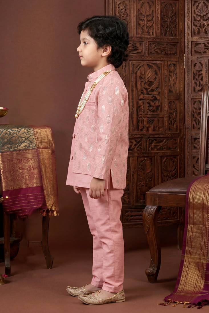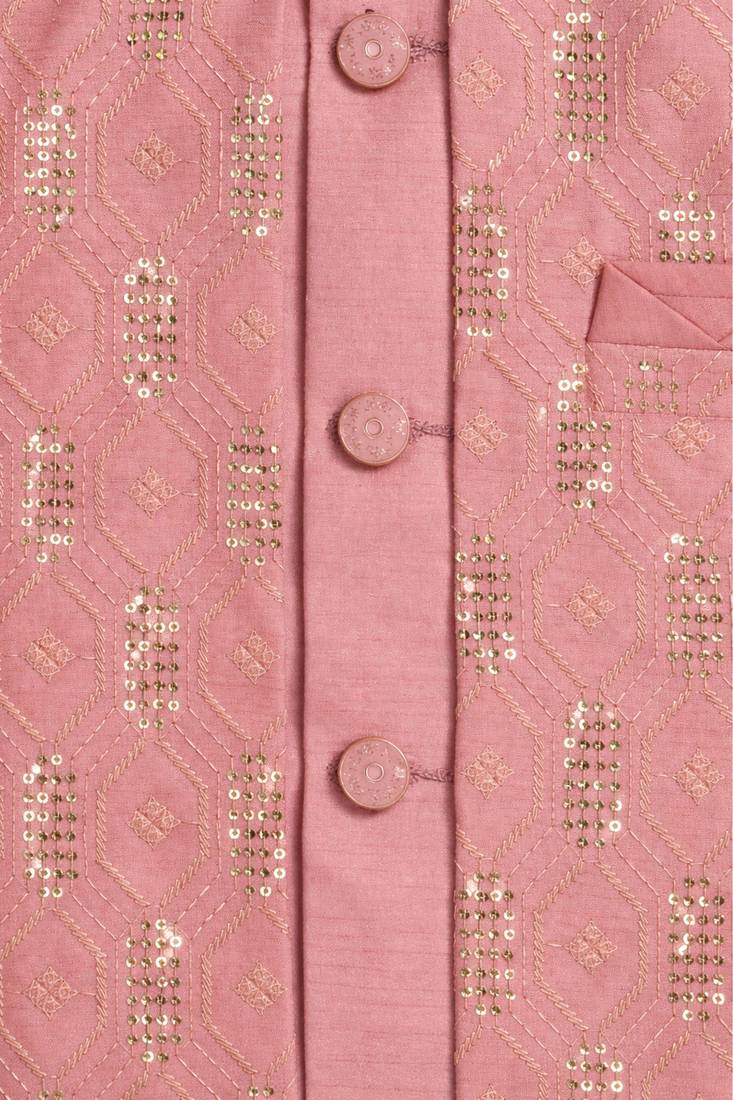 | Product Name | Boys Blush Pink Cotton Silk Geometric Embroidered Sherwani Set With Jacket & Necklace | |
