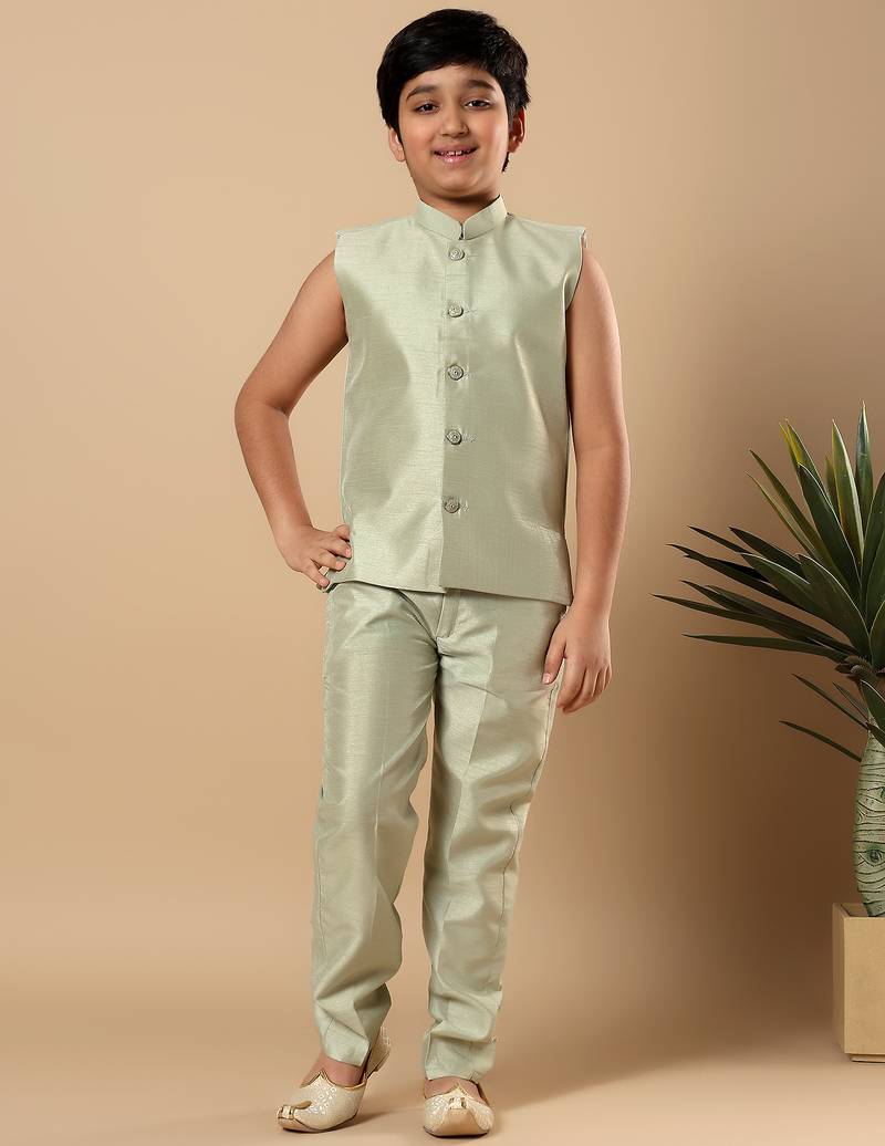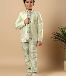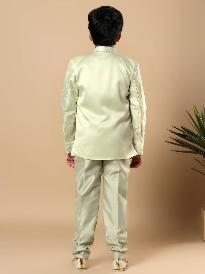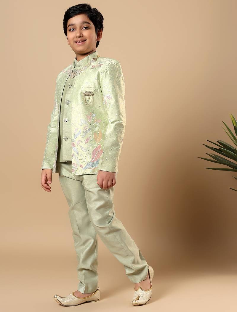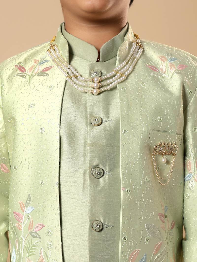 | Product Name | Boys Pista Green Cotton Silk Floral Vine Embroidered Sherwani Trouser Set With Jacket & Necklace | |