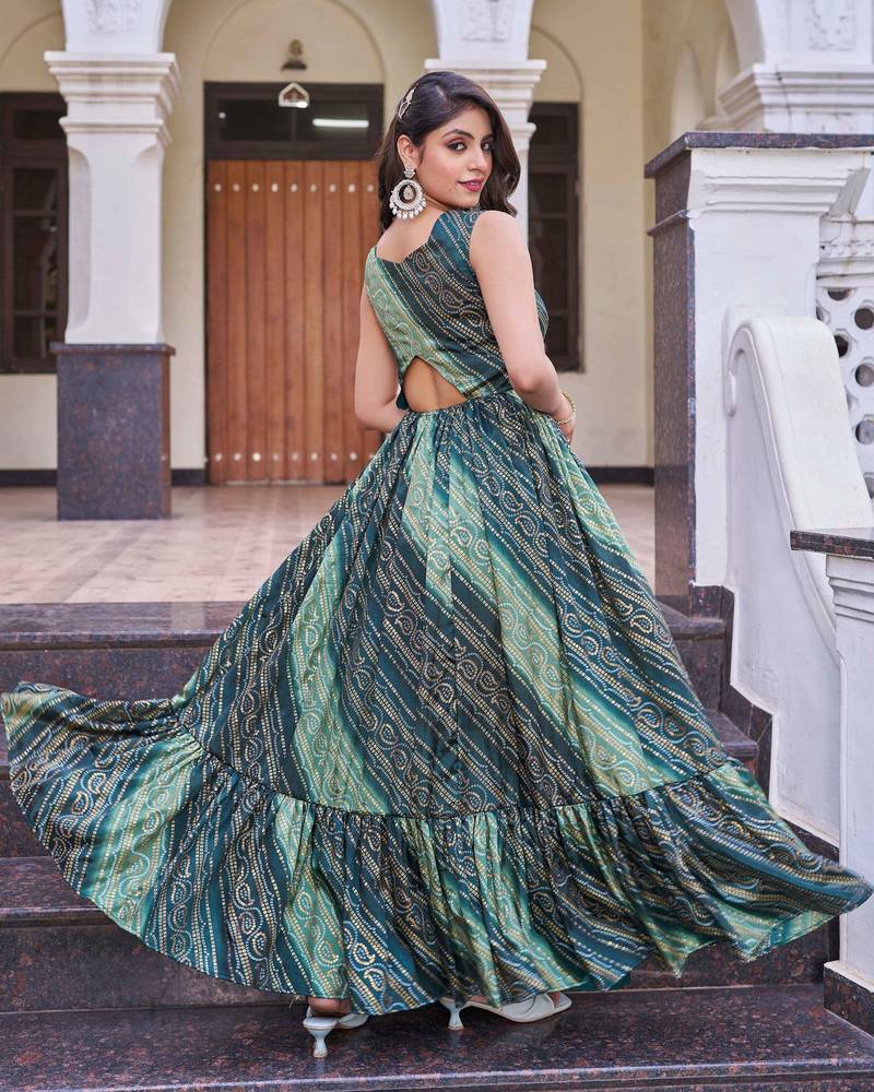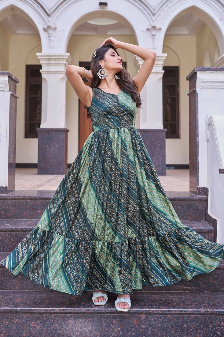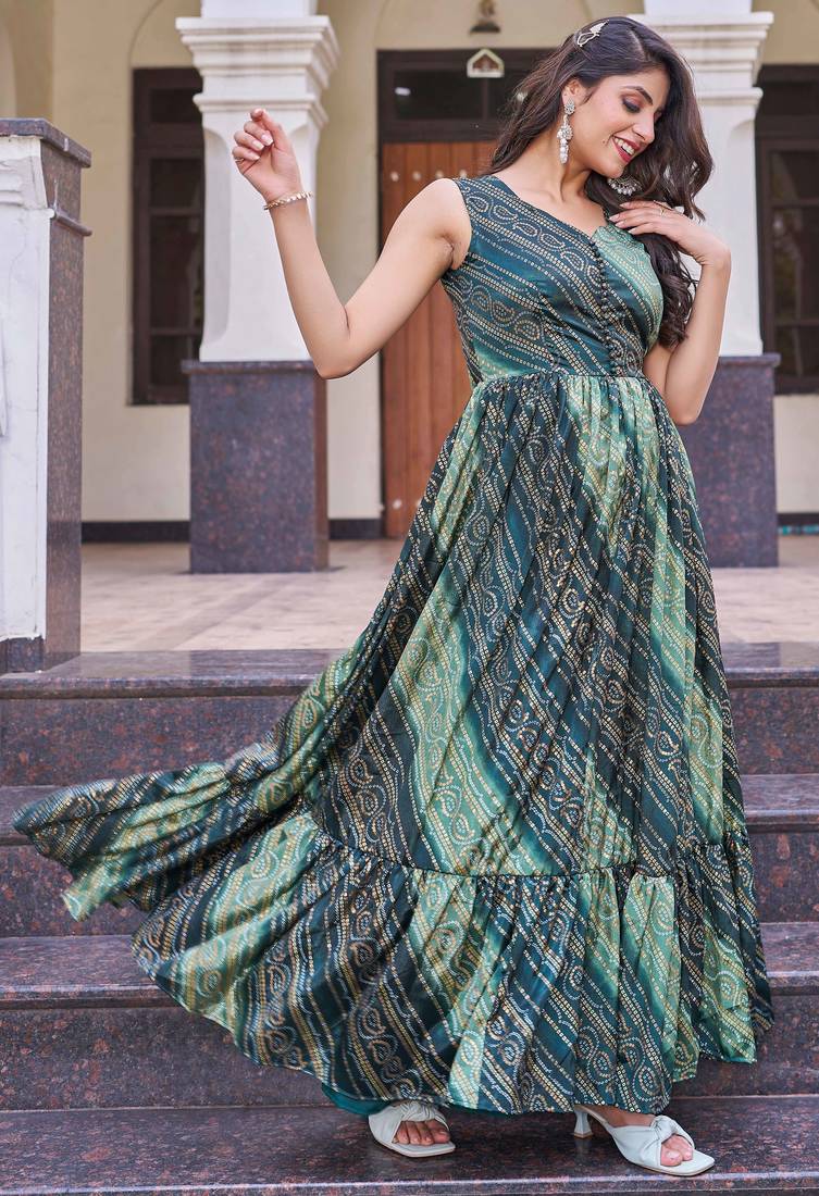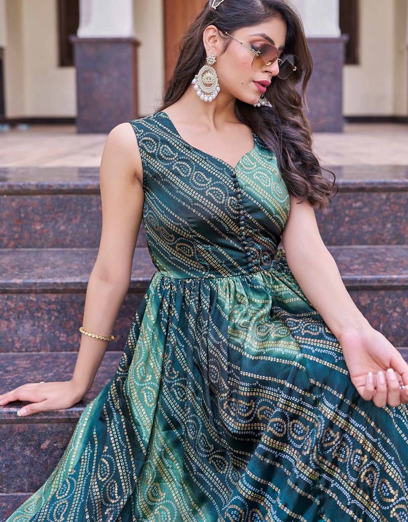 | Product Name | Women Green Bandhani Printed Pleated Anarkali Gown | |