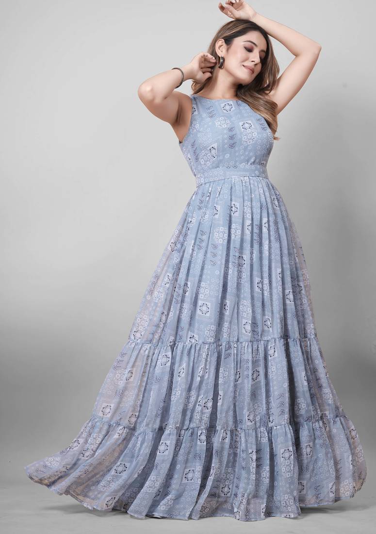 | Product Name | Women Grey Geometric Print Pattern Georgette Fit & Flare Gown | |