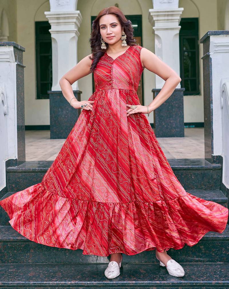 | Product Name | Women Red Bandhani Printed Pleated Anarkali Gown | |