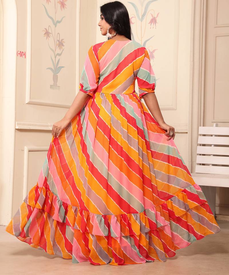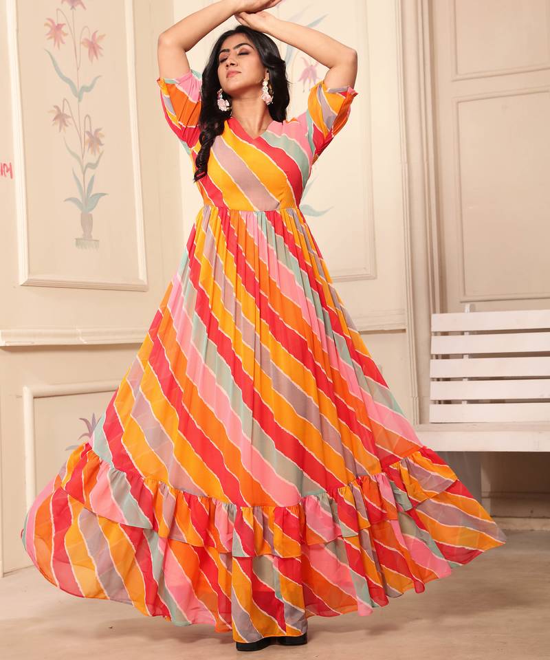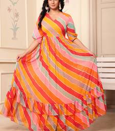| Product Name | Women Yellow Red Striped Print Georgette Fit & Flare Gown | |