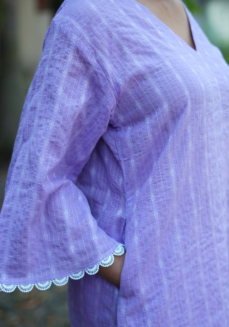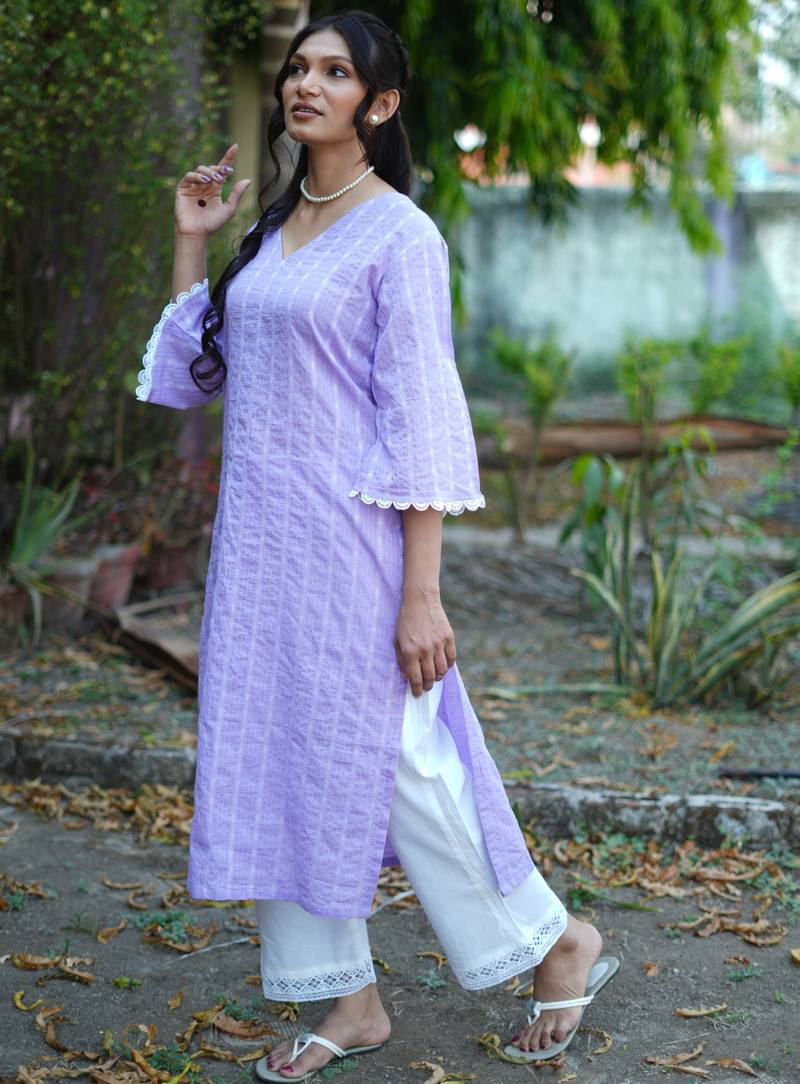 | Product Description | This Lavender Kurti Pant Set Is Crafted From Cotton Fabric With Detailed Kantha Work On The Kurti. The Design Features Bell Sleeves Finished With Crochet Lace Edging. A Functional Pocket Is Added On The Kurti For Daily Use. The Wide Leg Pants Come With A Half Elastic And Half Belt Waistband For A Structured Fit. Crochet Lace Detailing Is Added At The Pant Bottom For A Refined Finish. The Breathable Cotton Fabric Ensures Comfort For Casual And Everyday Ethnic Wear. |