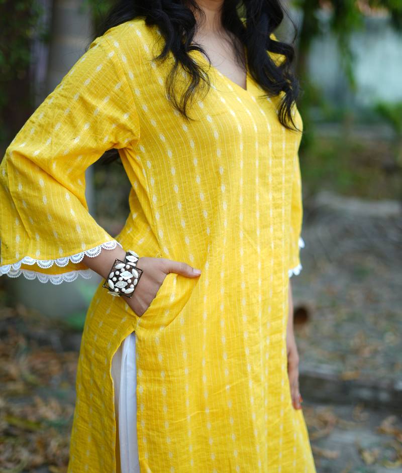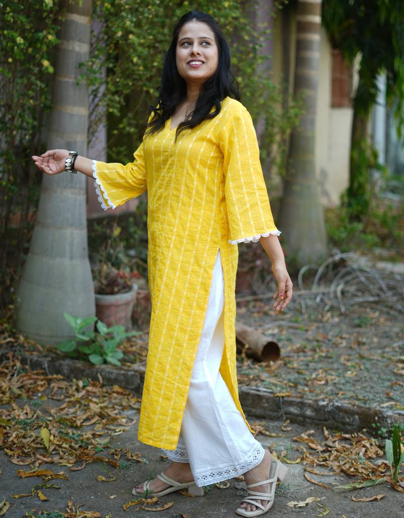 Yellow cotton kurti pant set with kantha work design