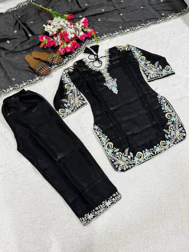| Product Description | Experience Regal Luxury With This Black Velvet Salwar Kameez. The Rich Fabric Is Adorned With Delicate Floral Threadwork And Sequin Accents Along The Neckline, Sleeves, And Hem. Accompanied By An Embroidered Organza Dupatta And Sleek Trousers, This Sophisticated Outfit Offers A Timeless Look For Winter Weddings And Formal Galas. |