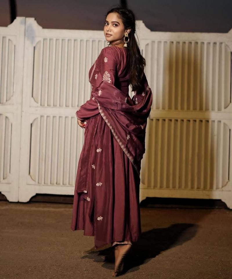 Chocolate silk blend embroidered gown set stitched