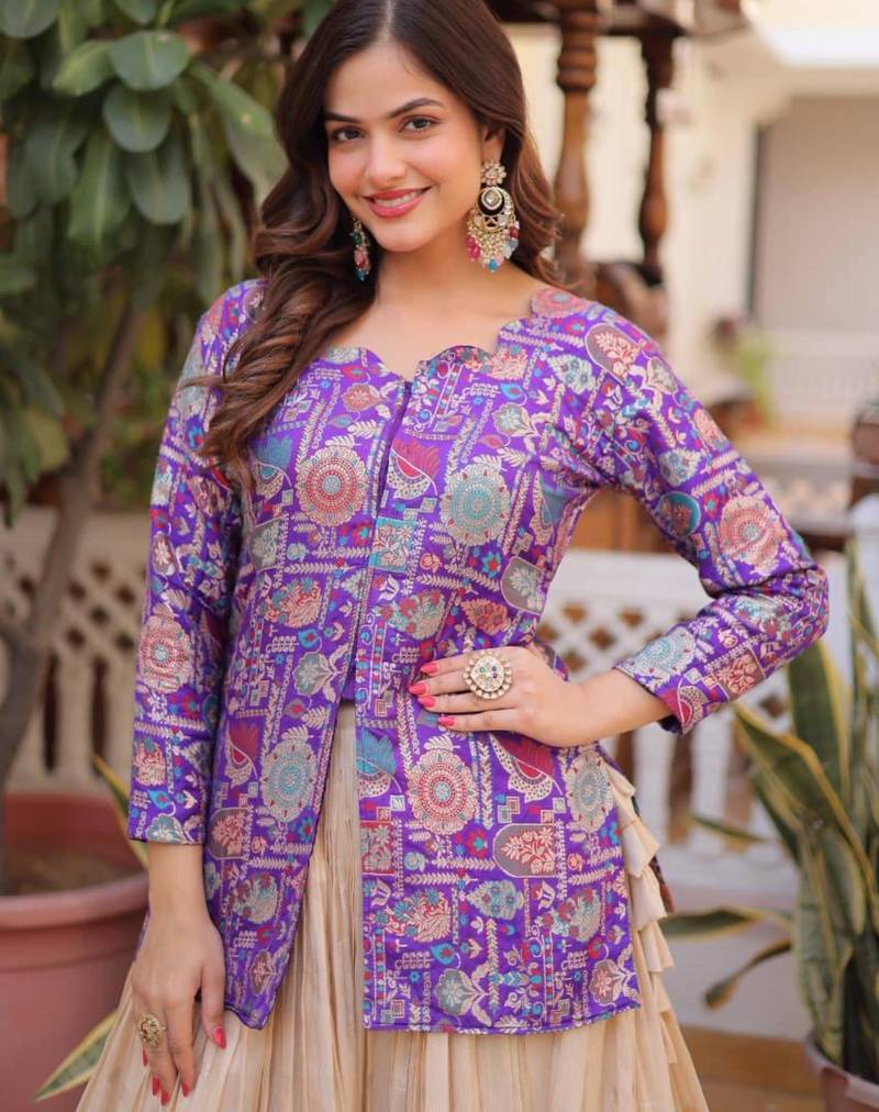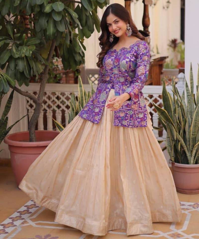 | Product Description | Elevate Your Style With This Cream Jacquard Plain Lehenga Featuring A Vibrant Purple Blouse. The Contrast Between The Cream Circular Skirt And The Purple Zari Weaved Choli Creates A Stunning Visual Appeal. Finished With A Round Neck And Full Sleeves, This High Quality Set Is Designed For Ceremonial Excellence. |