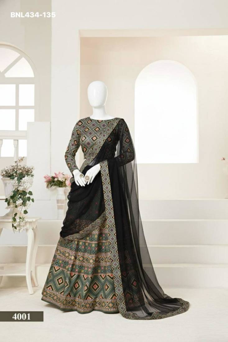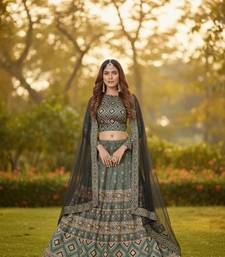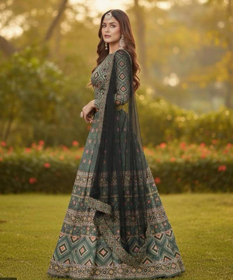 | Product Description | Elevate Your Ethnic Charm With This Green Ajmeri Silk Lehenga. The A Line Silhouette Features Vibrant Prints, Paired With A Matching Full Sleeve Choli And A Contrasting Black Plain Net Dupatta. Accented With Subtle Sequins, This Semi Stitched Ensemble Is Perfect For Ceremonial Events Where Traditional Style Meets Modern Comfort. |
