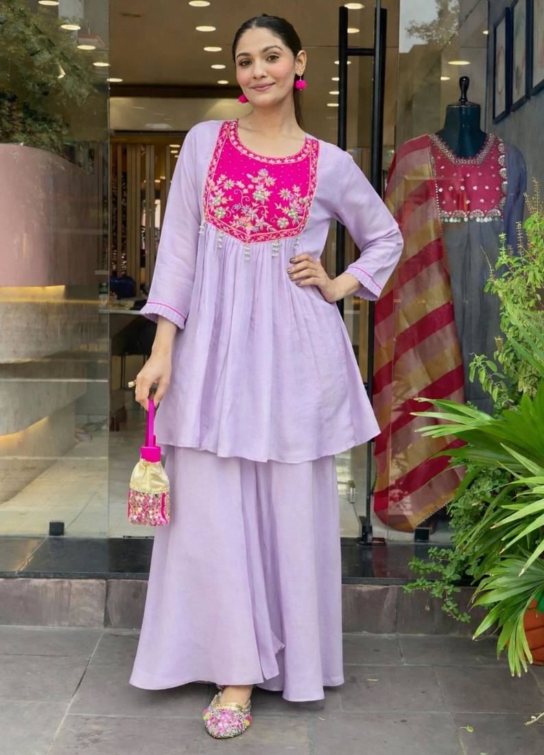 Showcase Uncompromising Contemporary Flair With This Vibrant Lavender Palazzo Set. Featuring An Elegantly Pleated High Low Tunic Elevated By A Striking, Contrasting Magenta Bodice Adorned With Intricate Floral Threadwork, This Chic Silhouette Delivers Unparalleled Modern Sophistication. Paired With Sweeping Wide Leg Trousers, This Versatile Ensemble Guarantees Effortless Upscale Daytime Glamour.