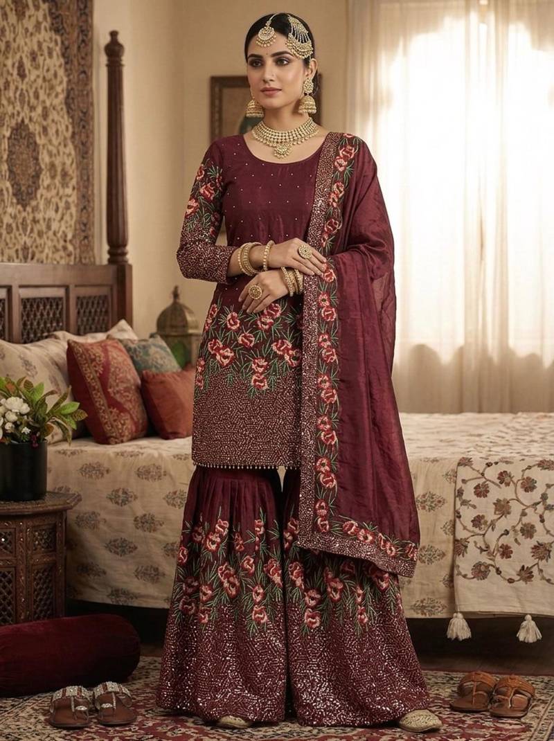 | Product Description | Exude Bridal Elegance In This Maroon Silk Blend Sharara. Every Inch Is Meticulously Crafted With Rose Inspired Floral Embroidery And Heavy Sequin Embellishments. Complete With An Ornate Dupatta, This Luxury Set Is Designed For The Modern Bride Or Wedding Guest Seeking A Cinematic, High Fashion Look For A Truly Special Night. |