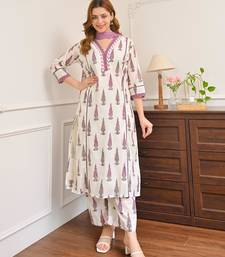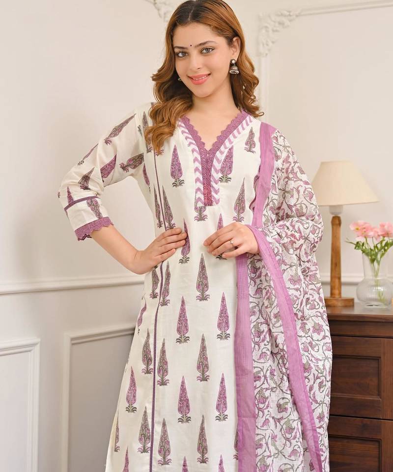 | Product Description | Embrace Understated Elegance With This Pristine Ivory And Purple Printed Suit. Showcasing Beautifully Detailed Traditional Block Print Motifs And Striking Chevron Neckline Accents, This Breathable Silhouette Offers Supreme All Day Comfort. Accompanied By A Gracefully Coordinated Floral Printed Sheer Dupatta, This Luxurious Minimalist Ensemble Perfects Refined Daytime Styling For Upscale Casual Occasions. |
