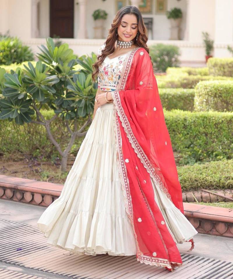 | Product Description | Experience Pure Elegance In This Off White Silk Embroidered Lehenga. The A Line Skirt And Sweetheart Neck Choli Feature Delicate Thread Embroidery For A Refined Look. A Bold Red Silk Dupatta Adds A Splash Of Traditional Color, Making This Ensemble A Perfect Choice For Brides Or Guests At Ceremonial Events. |