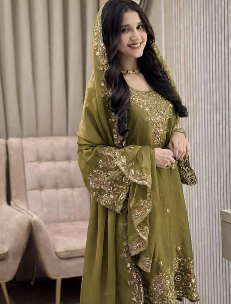 | Product Description | Sophistication Meets Tradition In This Olive Green Silk Ensemble. The Suit Is Adorned With Detailed Gold Lace And Sparkling Sequins, Offering A Subtle Yet Luxurious Glow. The Rich Earth Tone And Elegant Drape Make It A Perfect Selection For Those Seeking A Unique, High Fashion Take On Classic Ethnic Wear. |