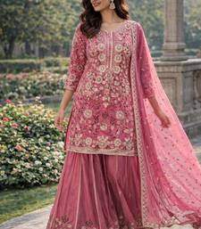 | Product Description | Exude Opulent Glamour In This Magnificent Pink Sharara Suit. Showcasing Lavish, Intricately Woven Gold Floral Embroidery Across The Tailored Kurta And Dramatically Sweeping Trousers, This Majestic Ensemble Defines Traditional Luxury. Complete With A Stunning Embellished Sheer Dupatta, This Premium Masterpiece Is Impeccably Designed For High End Weddings And Grand Celebrations. |