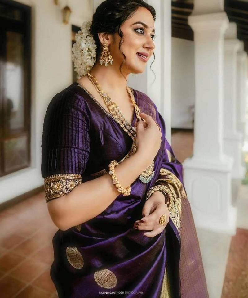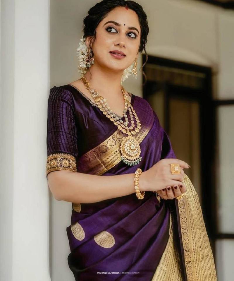 | Product Description | Capture The Regal Spirit In This Purple Silk Blend Saree. Adorned With Traditional Gold Zari Buttas And An Ornate Wide Border, This Garment Represents Pure Luxury. The Deep Jewel Tone Combined With A Matching Textured Blouse Creates A Majestic Look, Perfect For Brides And Festive Ceremonies Seeking A Heritage Rich Appearance. |