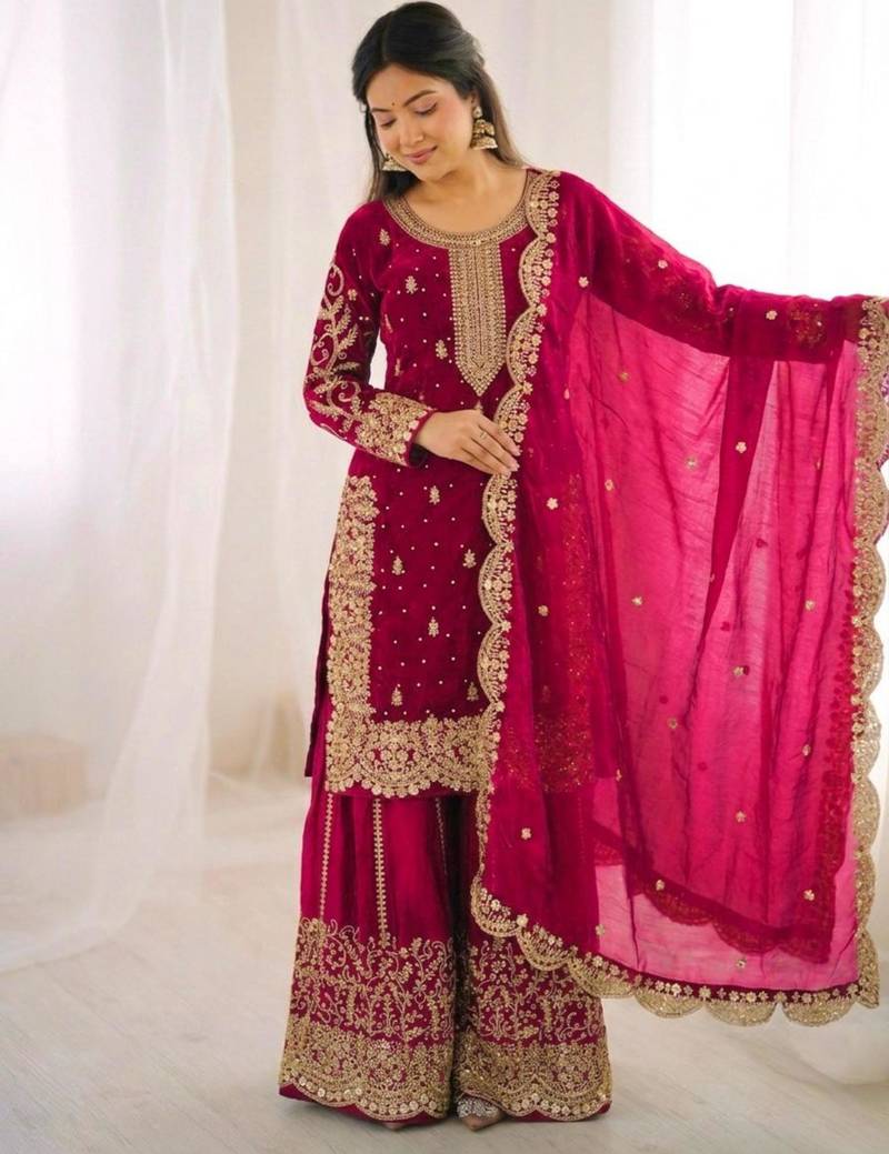 | Product Description | Make A Bold Statement In This Vibrant Magenta Pink Sharara Set. This Silk Blend Outfit Showcases Exquisite Gold Zardosi Work And Floral Motifs, Perfectly Blending Traditional Craftsmanship With A Modern Silhouette. Complete With A Beautiful Scalloped Dupatta, This Ensemble Is An Ideal Choice For Bridesmaids Or High Profile Festive Events. |