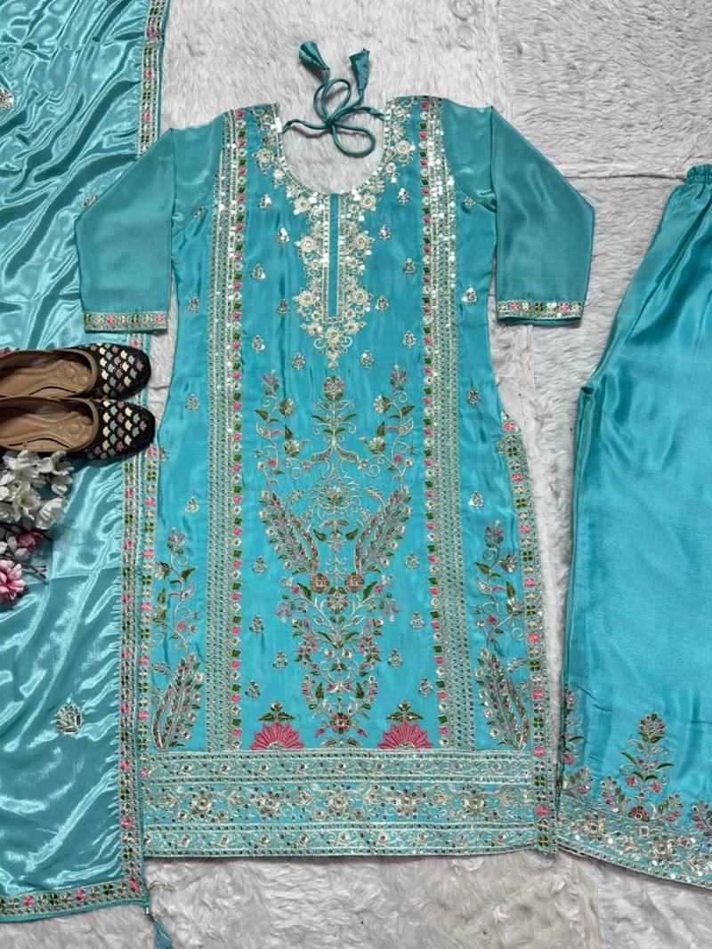 | Product Description | Experience Transcendent Elegance With This Exquisite Sky Blue Embroidered Georgette Suit. Highlighting Magnificent Multicolored Floral Threadwork And Subtle Shimmering Embellishments Across The Elegantly Tailored Tunic, This Opulent Ensemble Radiates Timeless Grace. Finished With Intricately Detailed Matching Trousers And A Coordinated Sheer Dupatta, This Sophisticated Masterpiece Defines Premium Celebratory Fashion. |