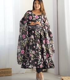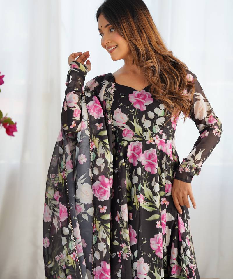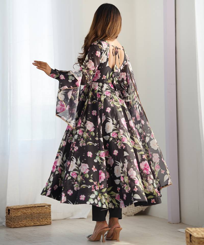 Pure soft organja silk fully flair kali and canvas patta with duppta set ,pent ready to wear stitched