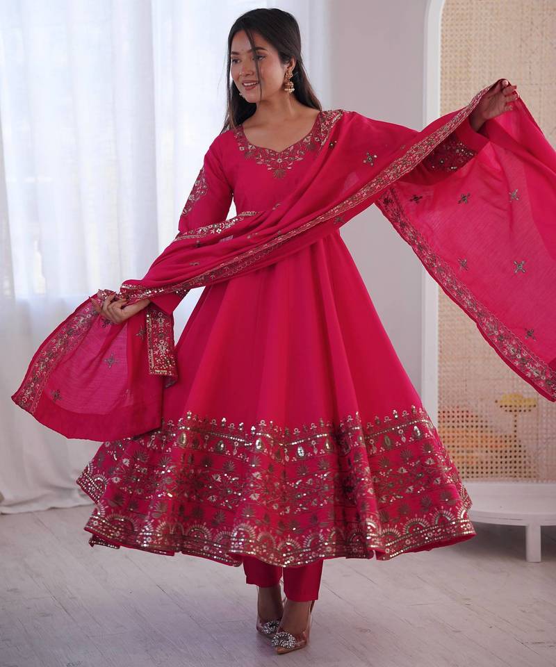 | Product Description | This Rani Pink Roman Silk Anarkali Set Features Rich Embroidery Sequence Work On The Gown And Dupatta, Paired With A 3.75 Meter Flair For That Perfect Festive Twirl. Premium Quality, Fully Stitched And Ready To Wear. This Rani Pink Anarkali Set Is Designed With Intricate Gold And Silver Sequence Work Along The Yoke, Sleeves, And A Heavy Embroidered Hem Panel. The Roman Silk Fabric Gives It A Luxurious Sheen While The Micro Cotton Lining Ensures Comfort For Long Hours. The Matching Roman Silk Dupatta Features Sequence Motifs And A Detailed Border For A Complete Festive Look. |
