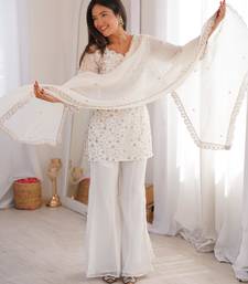| Product Description | This White Toned Crunchy Silk Set Uses All Over Jari And Sequence Embroidery For A Subtle Festive Glow—Perfect For Kitty Parties, Office Functions, And Elegant Day Wear. The Straight Kurta Features Delicate Floral Jaal Embroidery In Gold Jari And Sequins All Over, Paired With Wide Bell Bottom Pants For A Chic Retro Touch. The Matching Dupatta Comes With Embroidered Butti And A Scalloped Lace Border That Elevates The Whole Look. Crunchy Silk Gives It A Rich Texture While Staying Super Lightweight And Easy To Carry. |