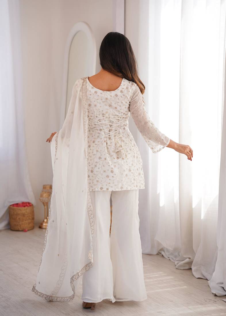 | Product Name | White Crunchy Silk Straight Kurta Bell Bottom Pant Set With Jari & Sequence Embroidery | |