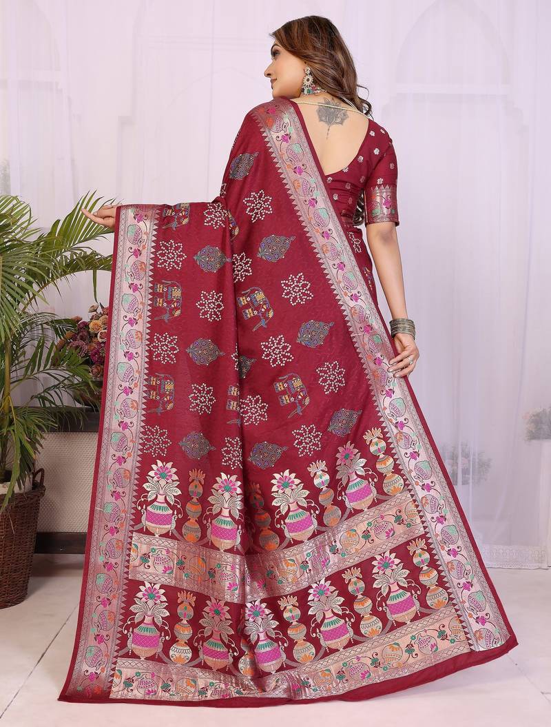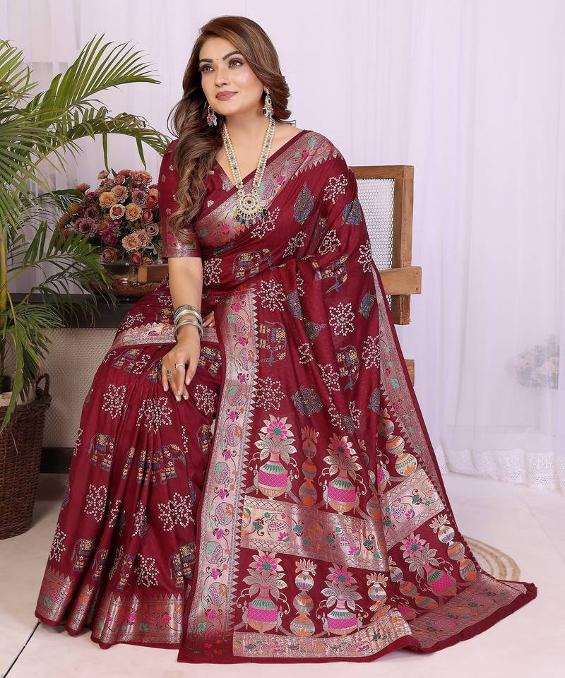 | Product Name | Maroon Dola Silk Bandhej Print Zari Weaving Saree With Matching Blouse Piece | |