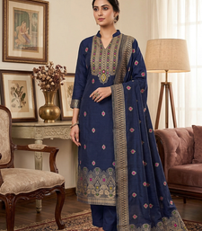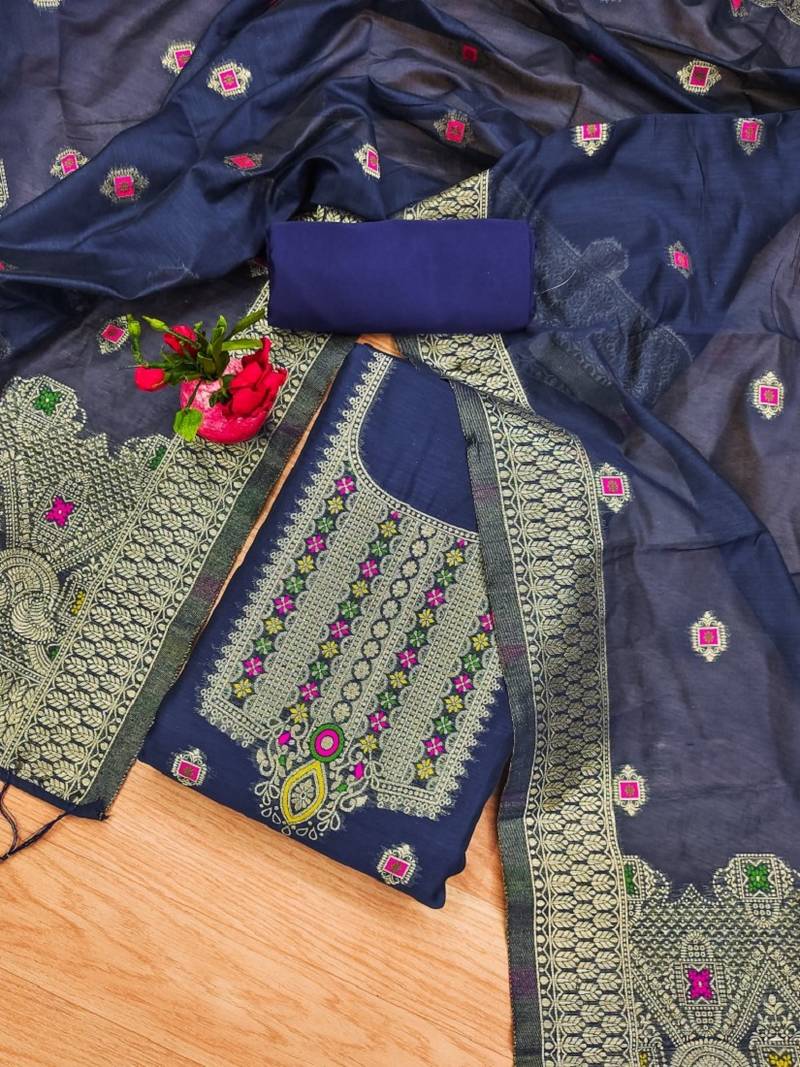 Blue pure chanderi banarasi silk pure zari woven design dress material unstitched