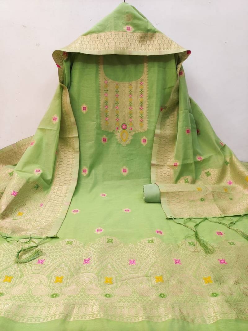 Pista chanderi banarasi silk zari woven design dress material unstitched