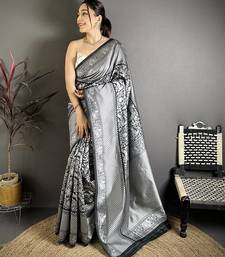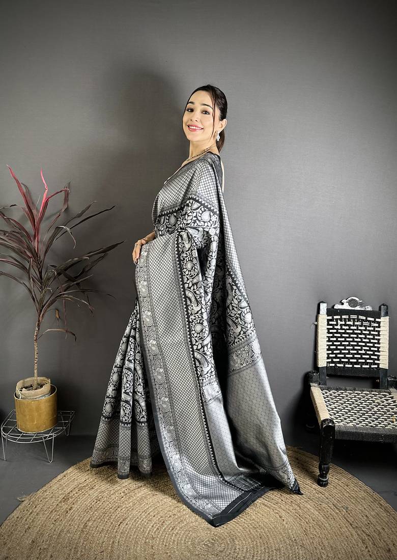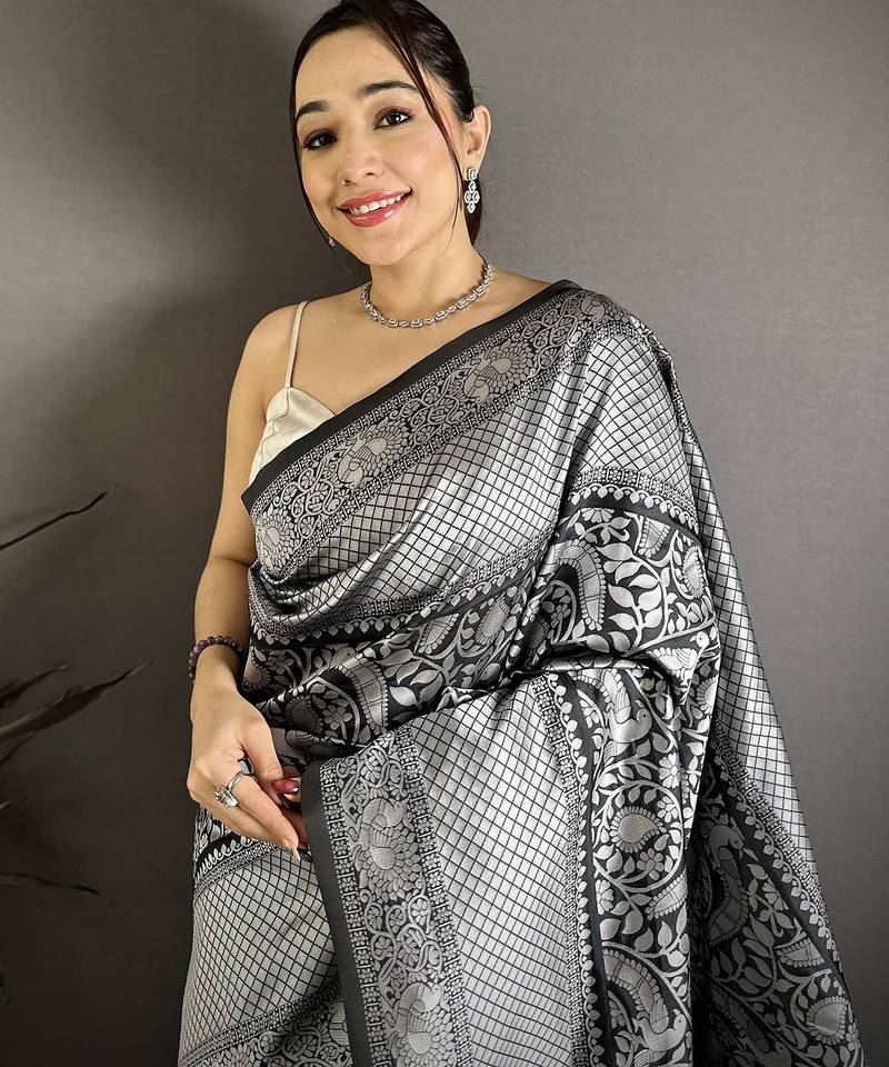 Women black floral motifs soft silk saree