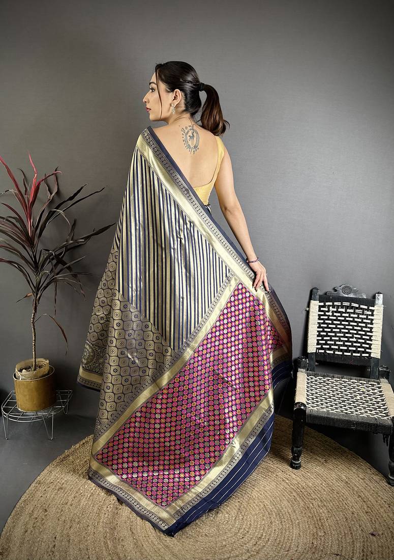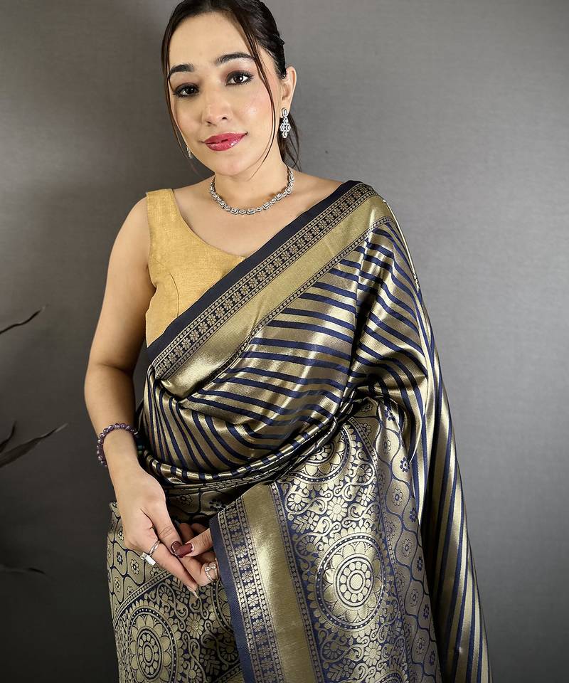 Women blue with golden geometric pattern soft silk saree