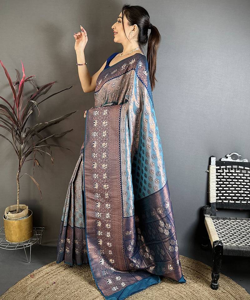 Women denim blue floral design with copper motifs tissue silk saree