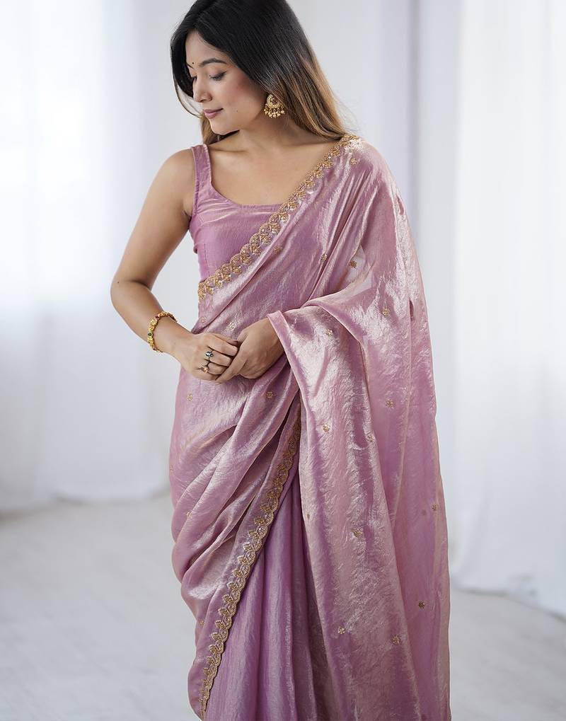 Women fandy silk pink zari lace work saree