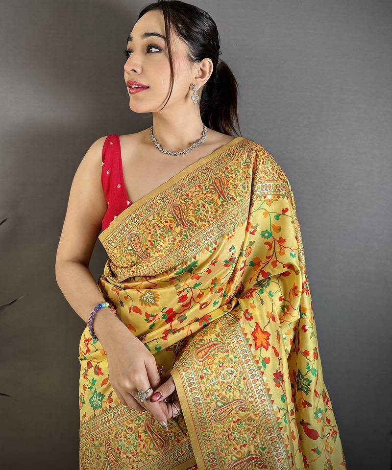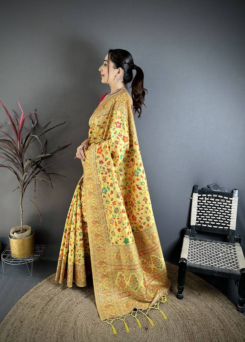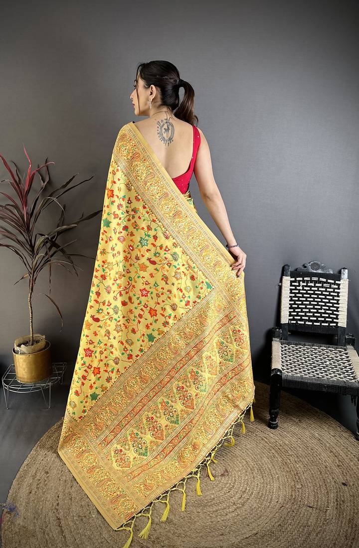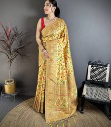 Women golden yellow meenakari weaving pashmina silk saree