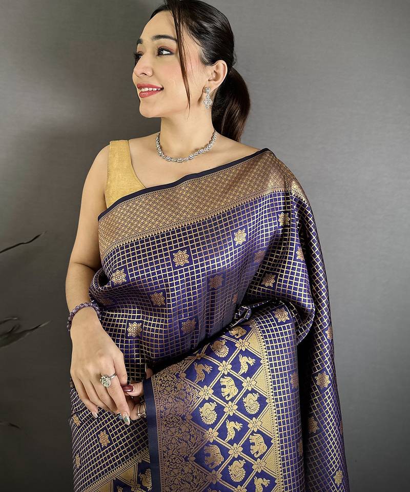 Women navy blue checked & floral motifs banarasi soft silk saree