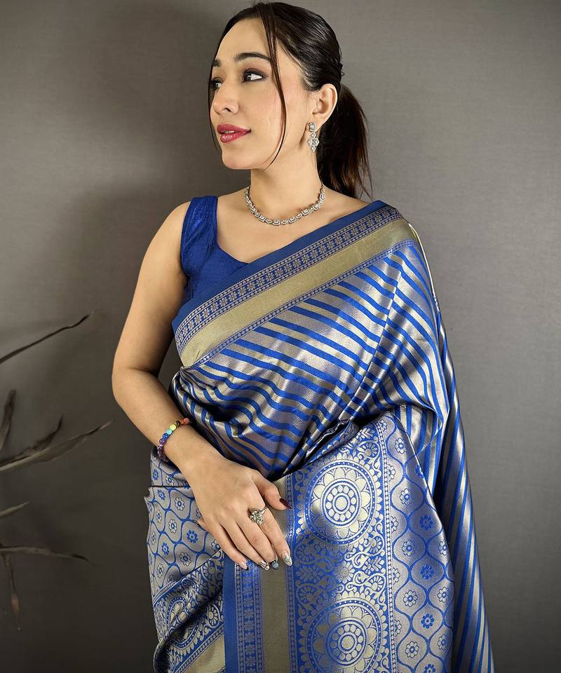 Women navy blue geometric pattern soft silk saree