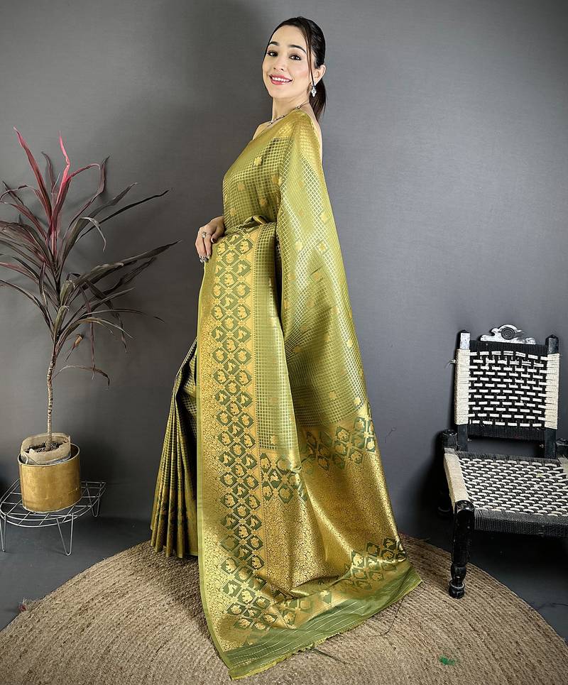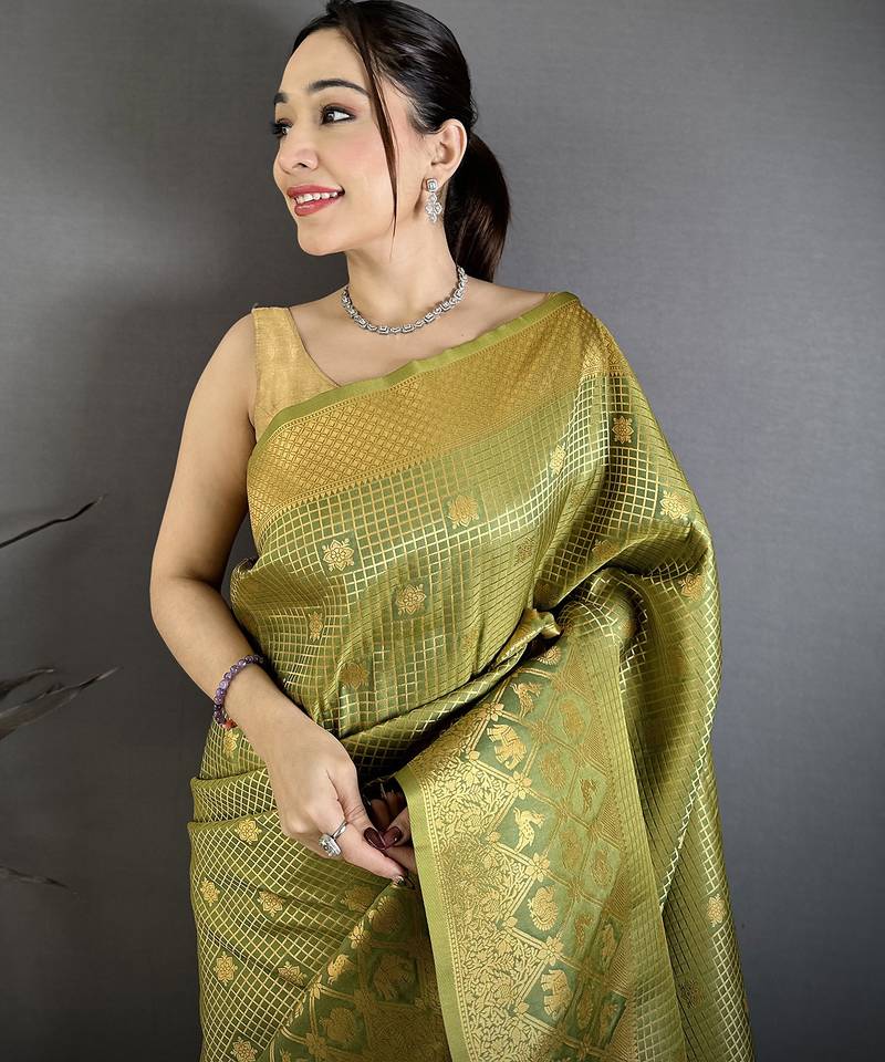 Women olive checked & floral motifs banarasi soft silk saree