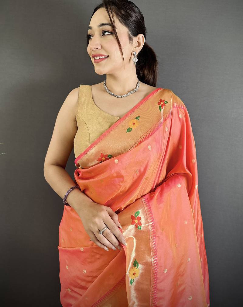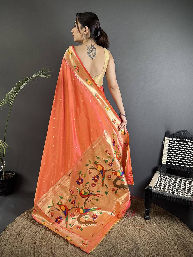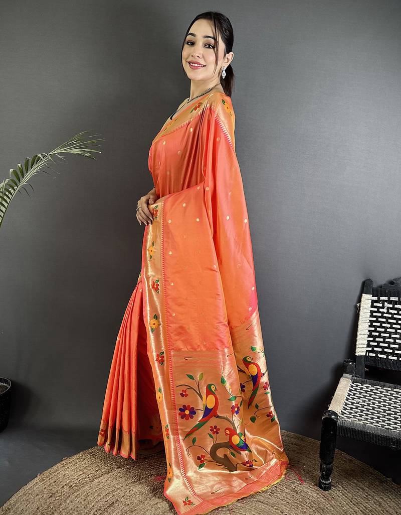 | Product Name | Women Orange Parrot & Floral Woven Design Lichi Silk Saree | |