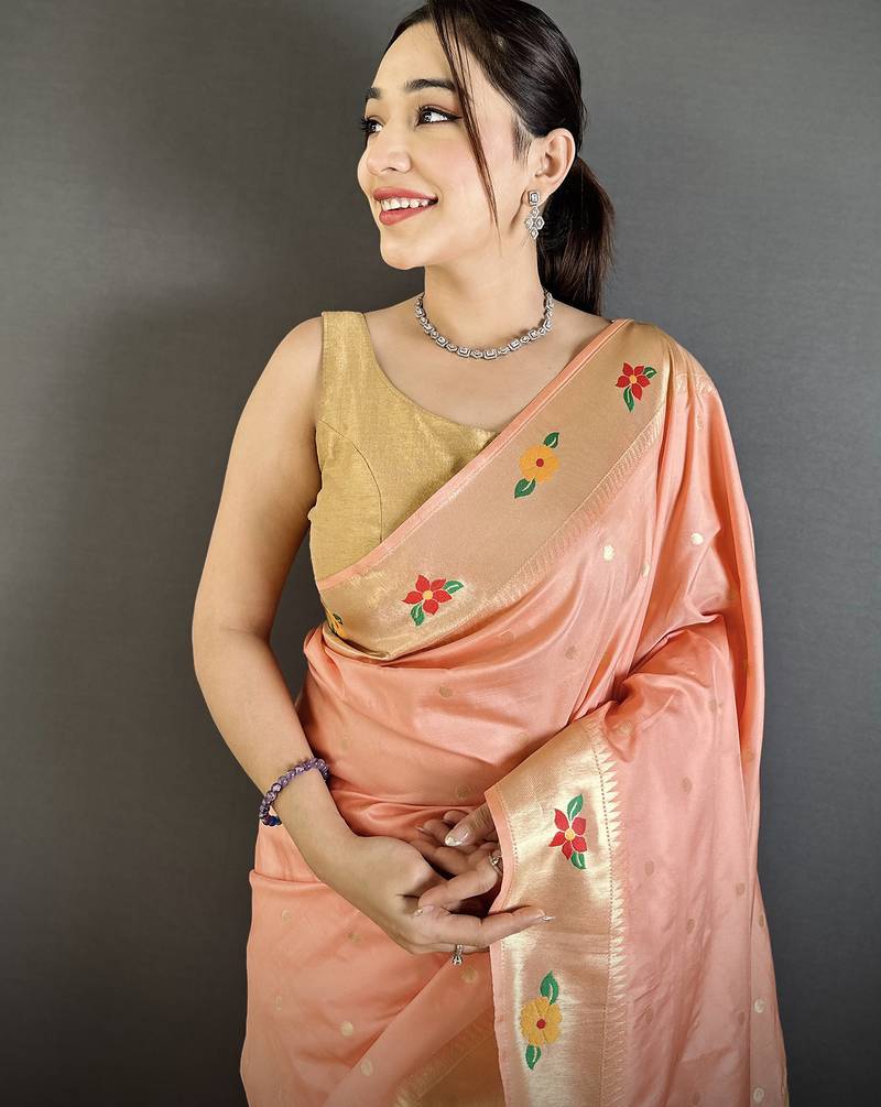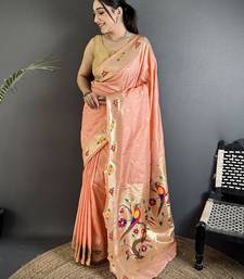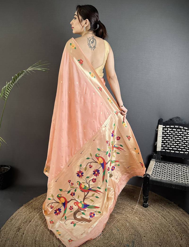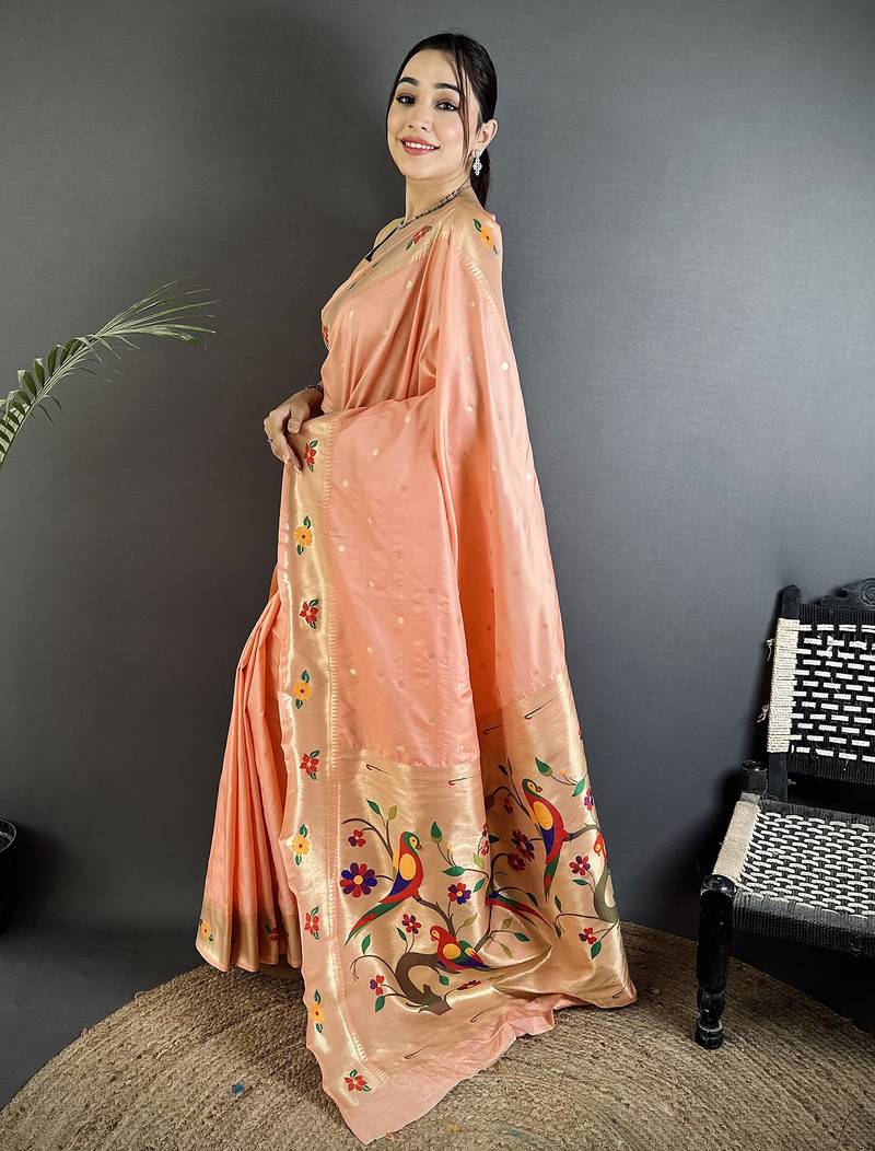| Product Name | Women Peach Parrot & Floral Woven Design Lichi Silk Saree | |