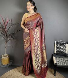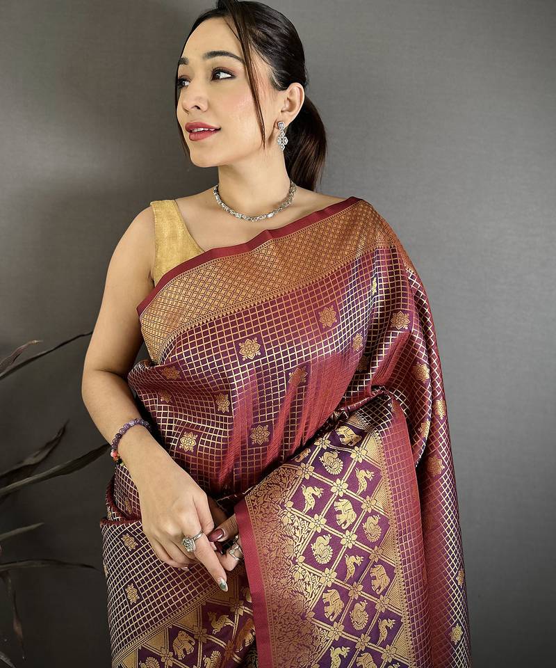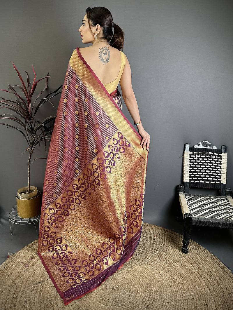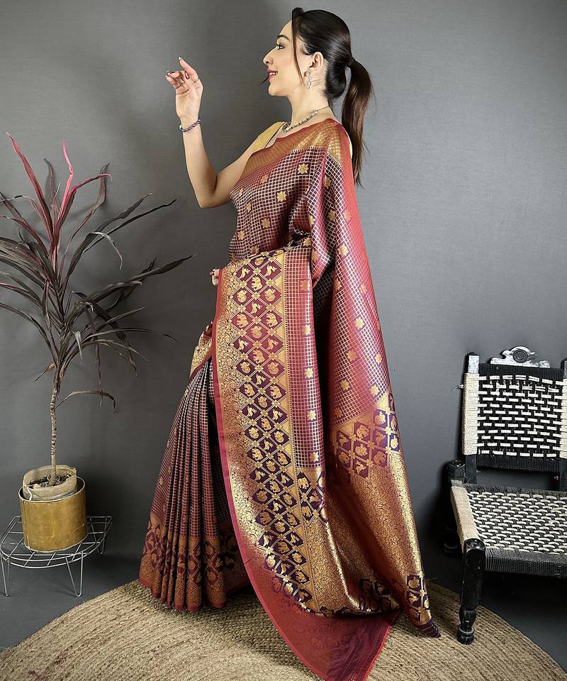 Women wine checked & floral motifs banarasi soft silk saree