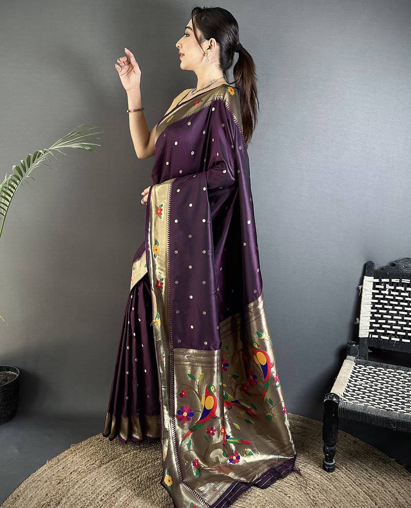 Women wine parrot & floral woven design lichi silk saree