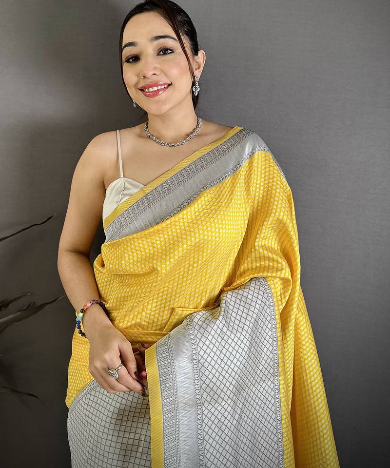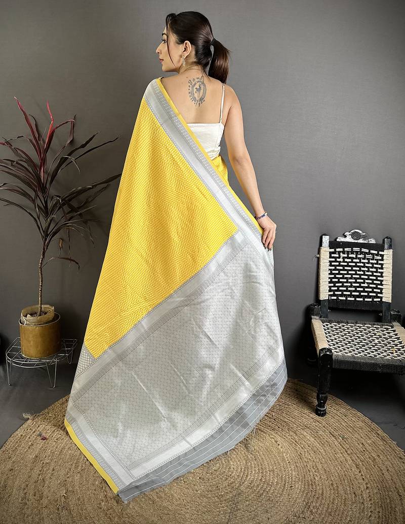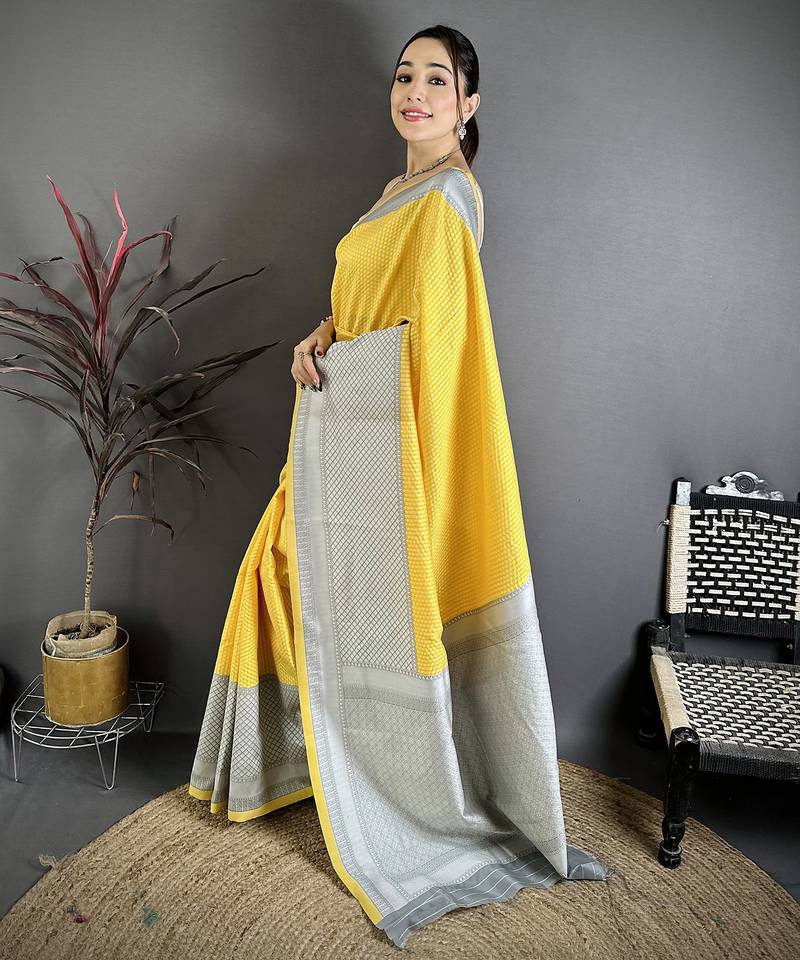 | Product Name | Women Yellow Intricate Geometric Soft Silk Saree | |