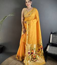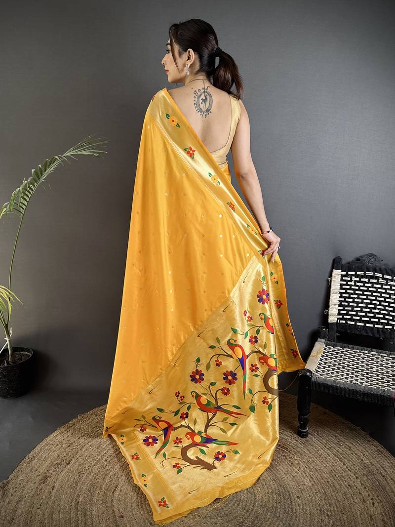 Women yellow parrot & floral woven design lichi silk saree