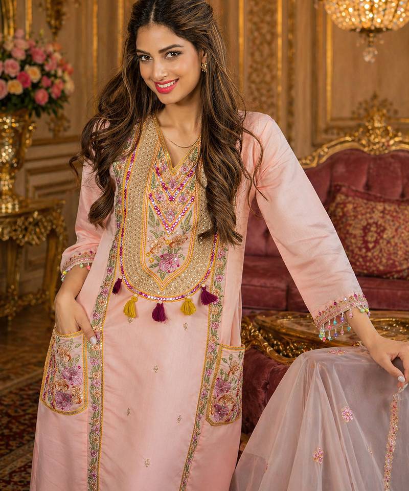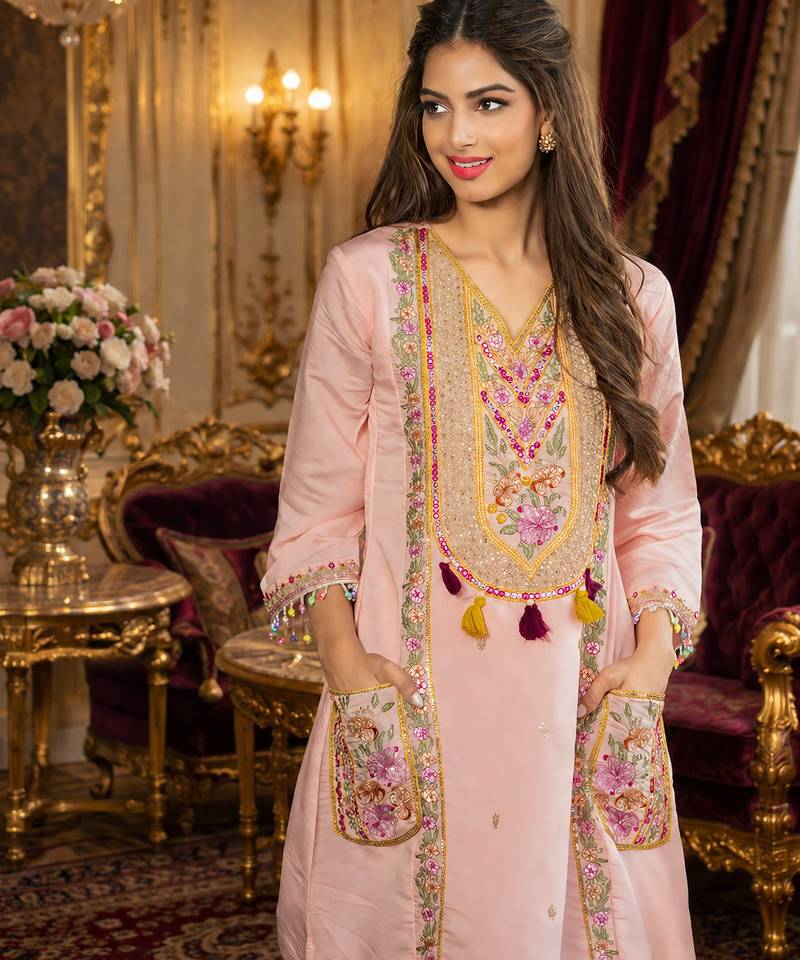 | Product Name | Designer Pink Ethnic Kurta Sharara Set With Heavy Embroidery & Dupatta | |