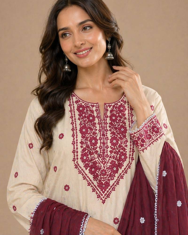 Elegant off-white embroidered kurta set with brown dupatta for women semi stitched