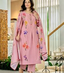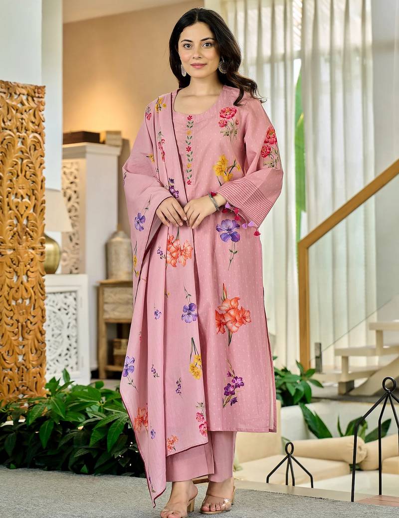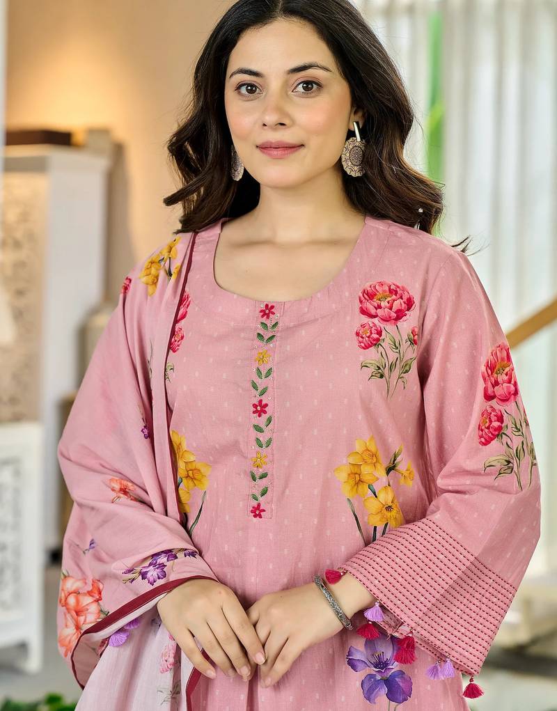Women’s pink floral kurta pant set with soft dupatta – stylish ethnic look
