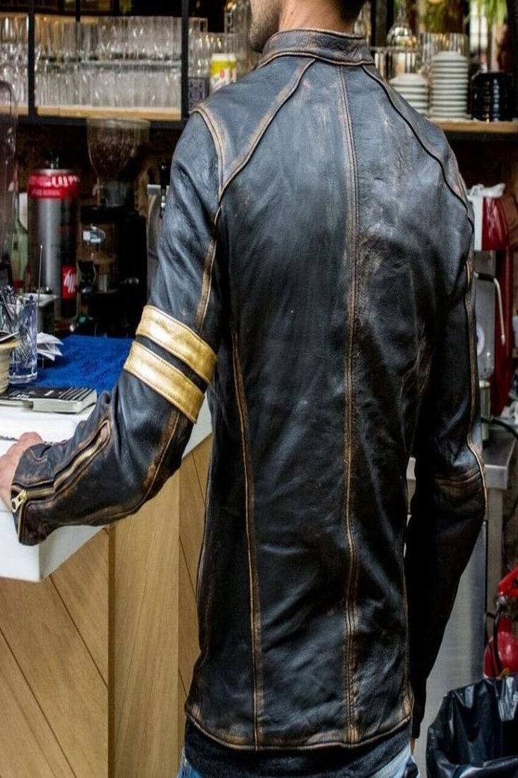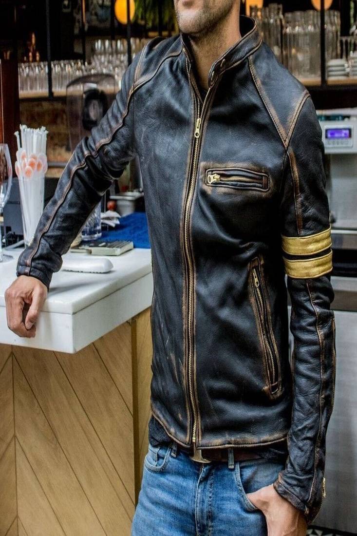 Mens genuine vintage black stylish pure lambskin leather biker jacket caramel strip